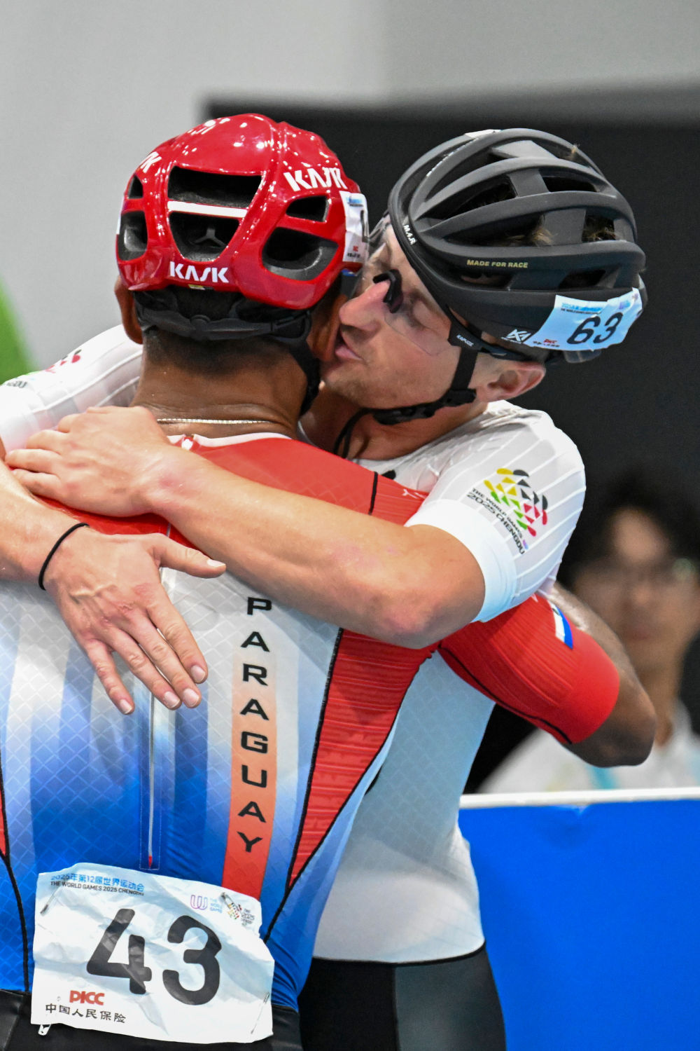 8月14日,瑞士选手温格(右)和巴拉圭选手米雷娜·奥尔蒂斯在速度轮滑场地赛(5000米积分)男子决赛后拥抱。