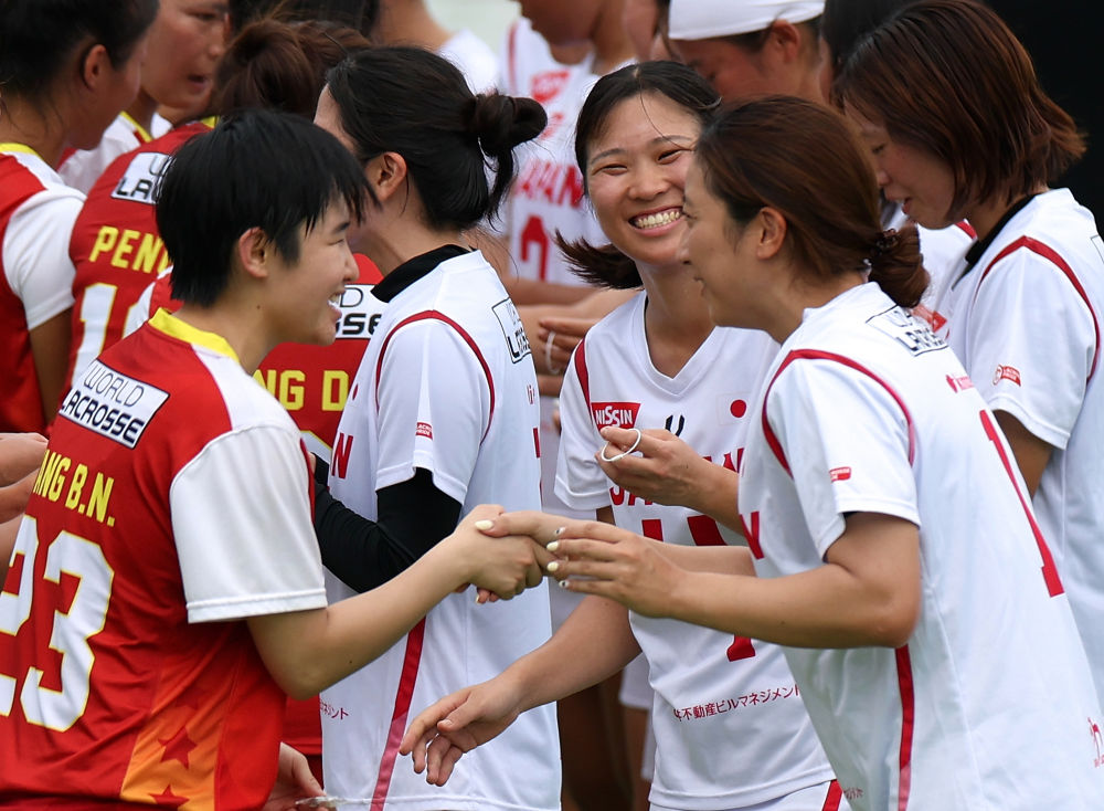 8月8日,中国队球员与日本队球员女子棍网球预赛A组比赛后握手致意。