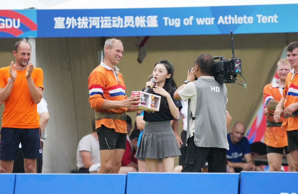 8月9日,现场主持人在男子室外拔河640公斤级预赛后给荷兰队选手文森特·瓦根曼斯送上生日礼物。