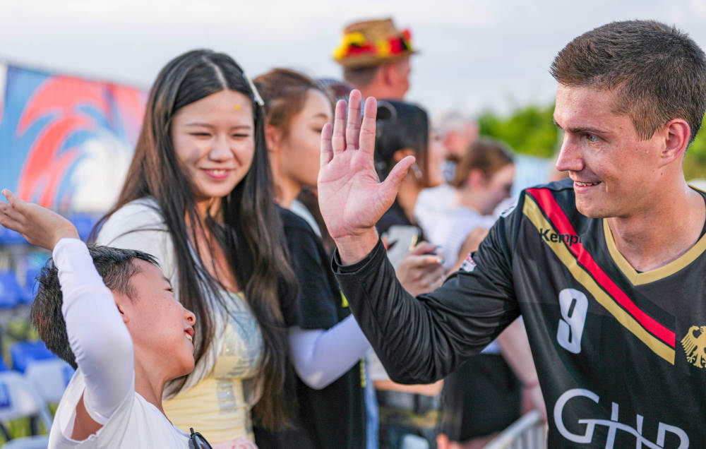 8月12日,德国队球员蒂蒙(右)浮士德球男子半决赛后与观众击掌。