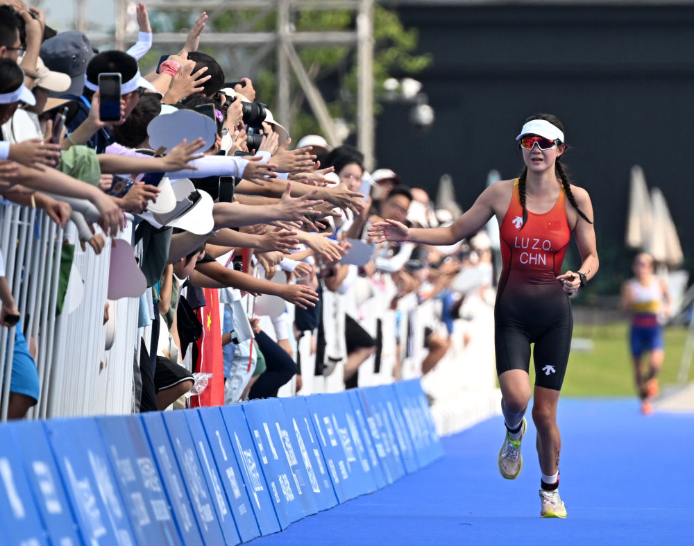 8月15日,中国选手路子清在铁人两项女子个人决赛冲线前与观众击掌互动。