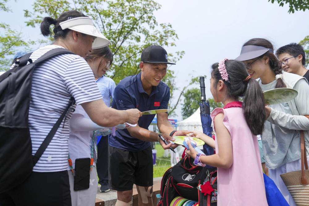 8月8日,中国选手赵辰菲(左三)在掷准飞盘混合双人预赛后为小朋友签名。