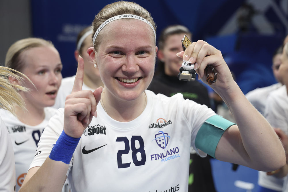 8月13日,芬兰队队长薇拉·考皮(前)在软式曲棍球女子金牌赛后向记者展示她的“幸运熊猫”挂件。