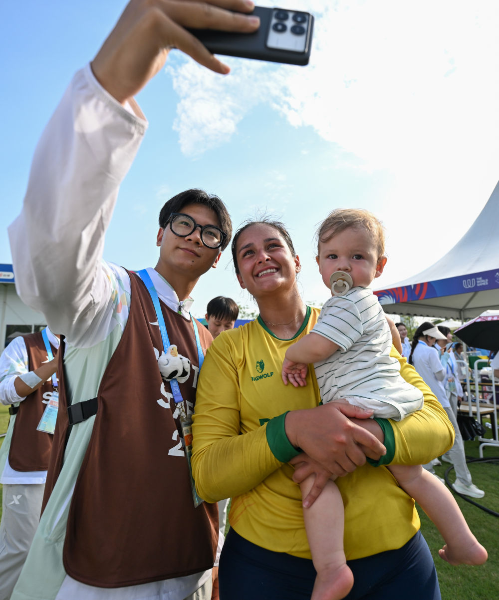 8月13日,巴西队球员萨比娜·祖费特在浮士德球女子决赛后抱着11个月大的孩子与志愿者合影。