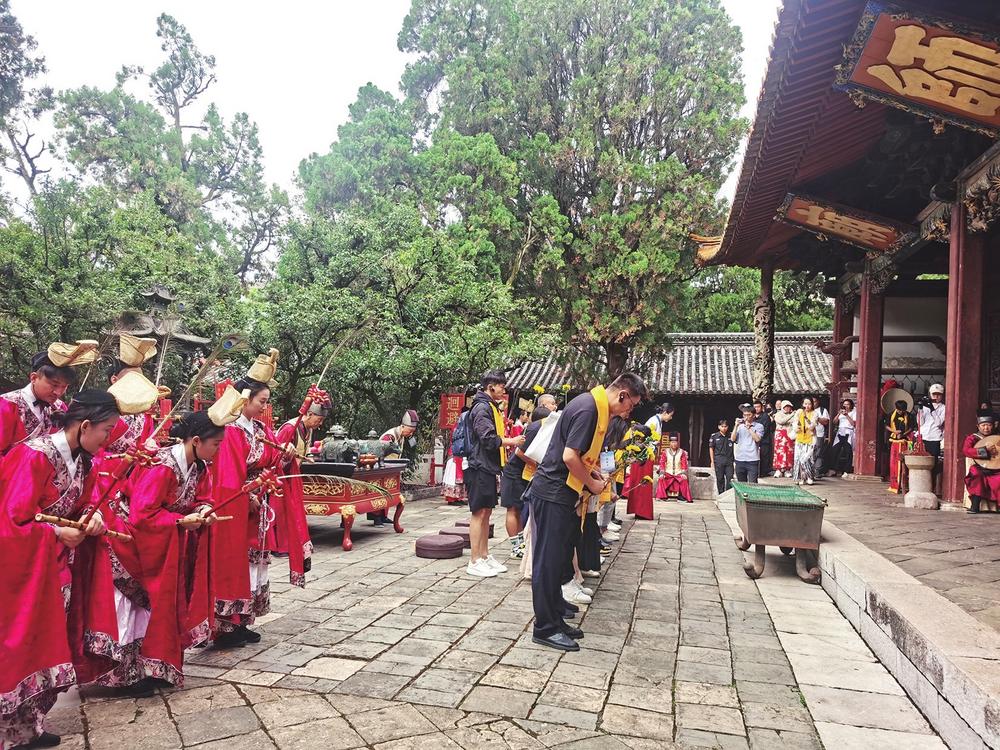 在建水文庙,采访团体验了庄重地佩戴绶带、盥洗、行正冠礼、迎圣进殿及初献、亚献、终献“三献礼”仪式。台湾大学生林同学感慨:“完全没想到,儒家文化在滇南古城能保存得如此完整、扎实。”