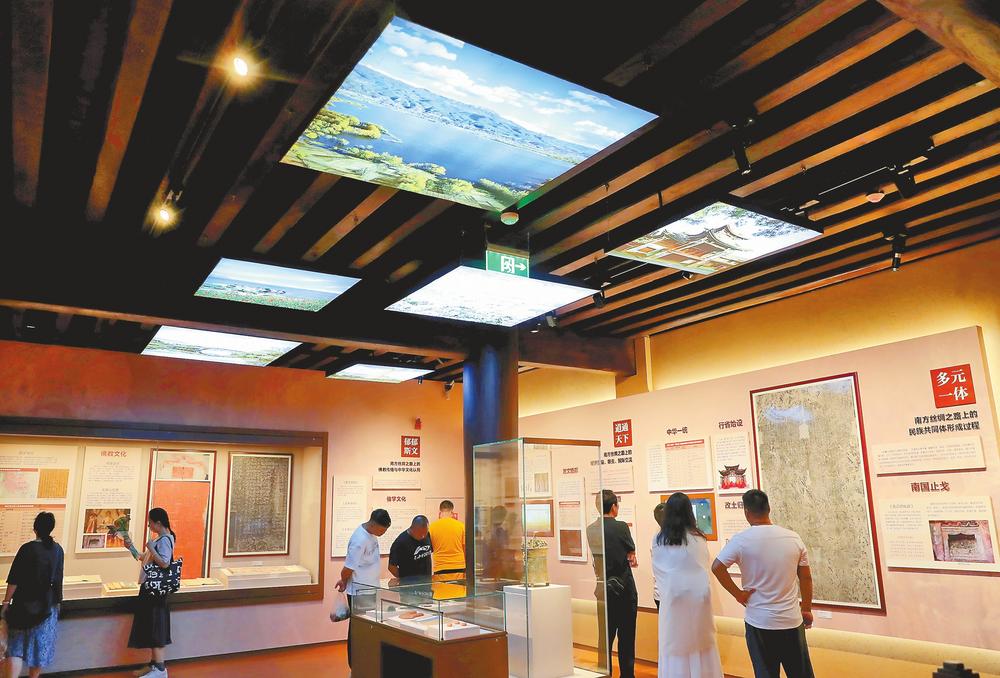 暑期以来,文博游持续升温,位于剑川古城的国家方志馆南方丝绸之路分馆吸引了全国各地的众多游客前来参观。图为游客在展厅了解南方丝绸之路历史文化。(云南日报 记者杨峥/摄)