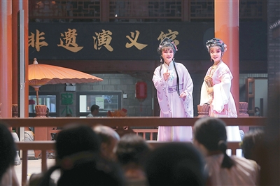 湖北省首批省级历史文化街区——荆门民主街“非遗夜市”上,湖北花鼓戏、沮漳皮影戏等传统戏曲轮番上演,引得游客驻足观赏。