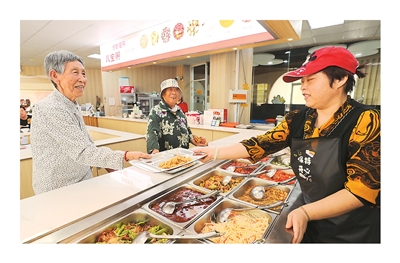 居民在山东省东营市东营区文汇街道中山社区幸福餐厅选餐。