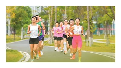 市民在重庆市垫江县桂溪街道三合湖湿地公园跑步。