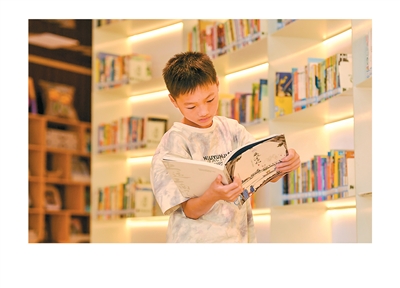 儿童在江西省宜春市袁州区珠泉街道明珠社区狮子山城市书房阅读、学习。