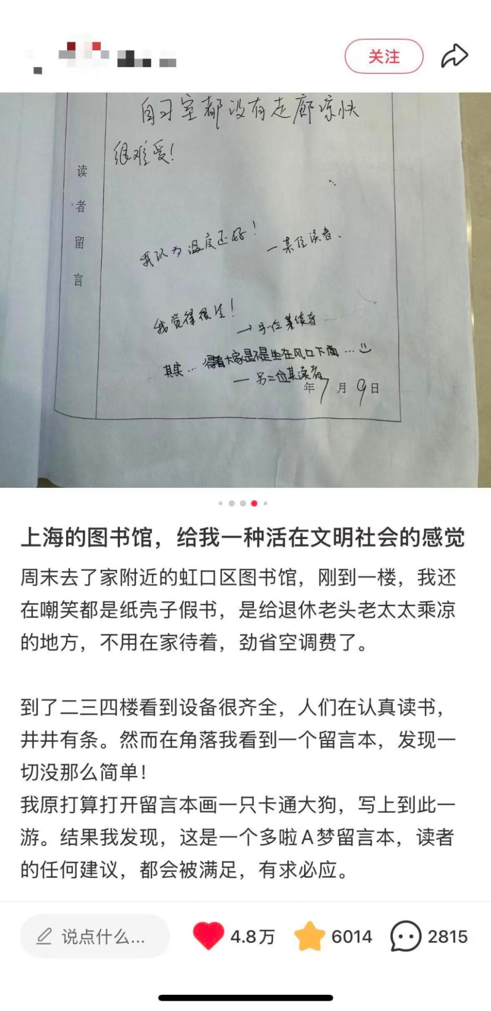 在上海虹口图书馆的“留言簿”上 ,许多读者写下的意见建议,都得到了图书馆的认真回应,网友将其称为“哆啦A梦留言簿”。澎湃新闻记者 邹桥 邹佳雯 编辑 何羽茜 部分素材来源 @邢早早(01:53)