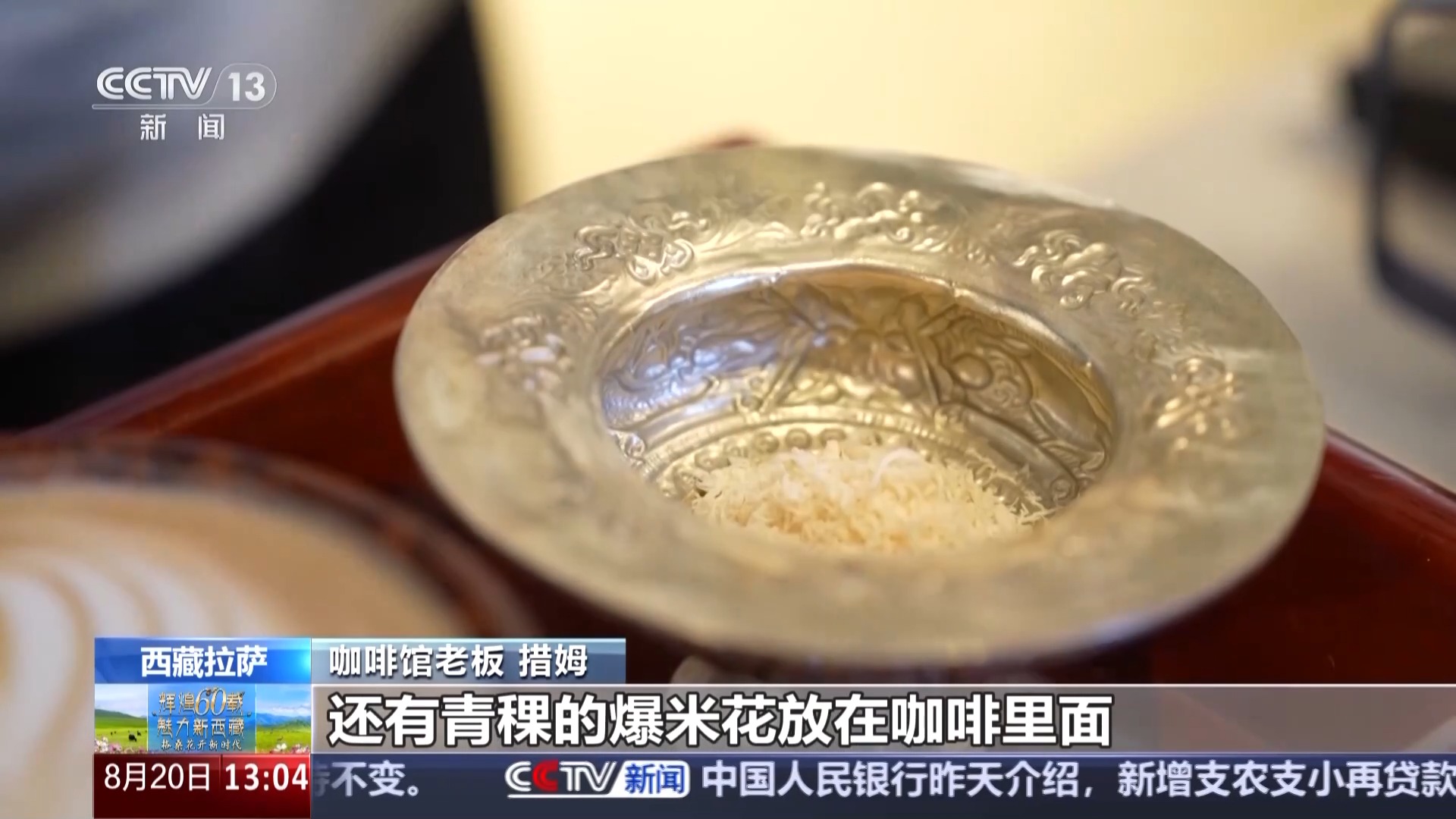 咖啡馆老板措姆:这款是我们店里面卖得最火爆的一款原创产品——拉萨拿铁,我们准备了牦牛奶的奶渣、酥油、青稞的爆米花放在咖啡里,让客人体验到西藏本地食材和咖啡融合的感觉。