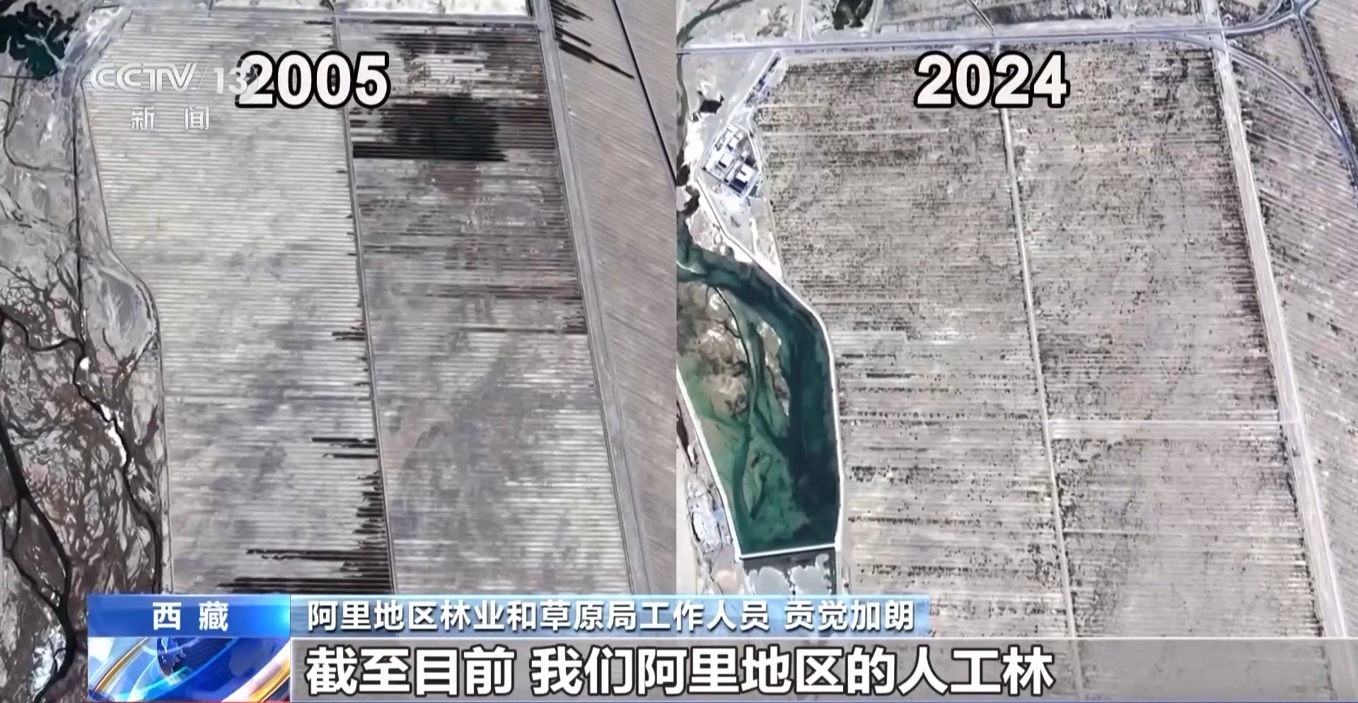 阿里地区林业和草原局工作人员 贡觉加朗:我现在所处的位置是狮泉河镇盆地生物防沙治沙工程所在地。之前这里是一片沙地,是狮泉河镇的风沙主要来源地。