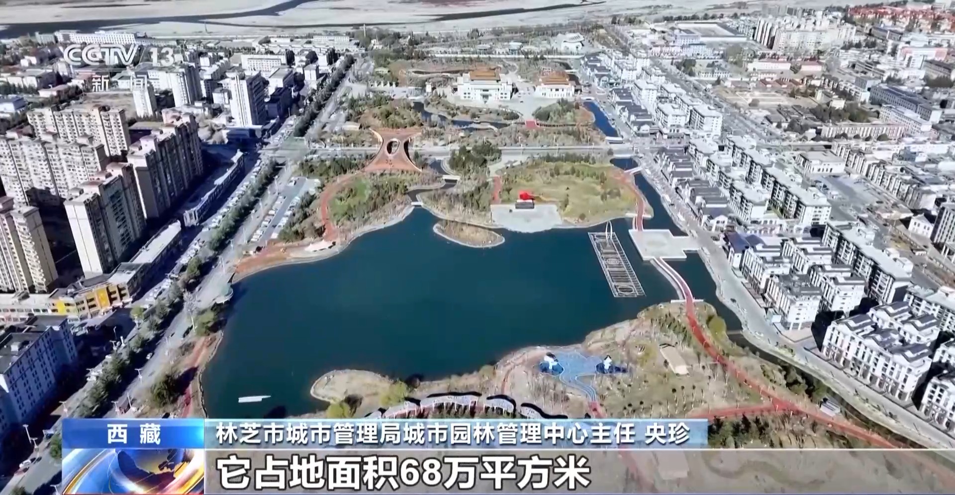 林芝市城市管理局城市园林管理中心主任 央珍:我现在所在的工布公园,占地面积68万平方米,由城市公园、生态公园、儿童公园、工布天街四个功能区组成,是一个功能比较齐全的综合类公园。
