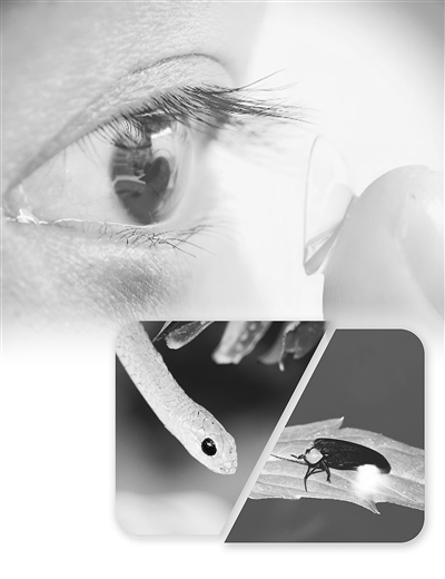 ①图为上转换隐形眼镜。佩戴它后,人类有望突破视觉限制,“看见”蛇、萤火虫等动物眼中的世界。受访单位供图