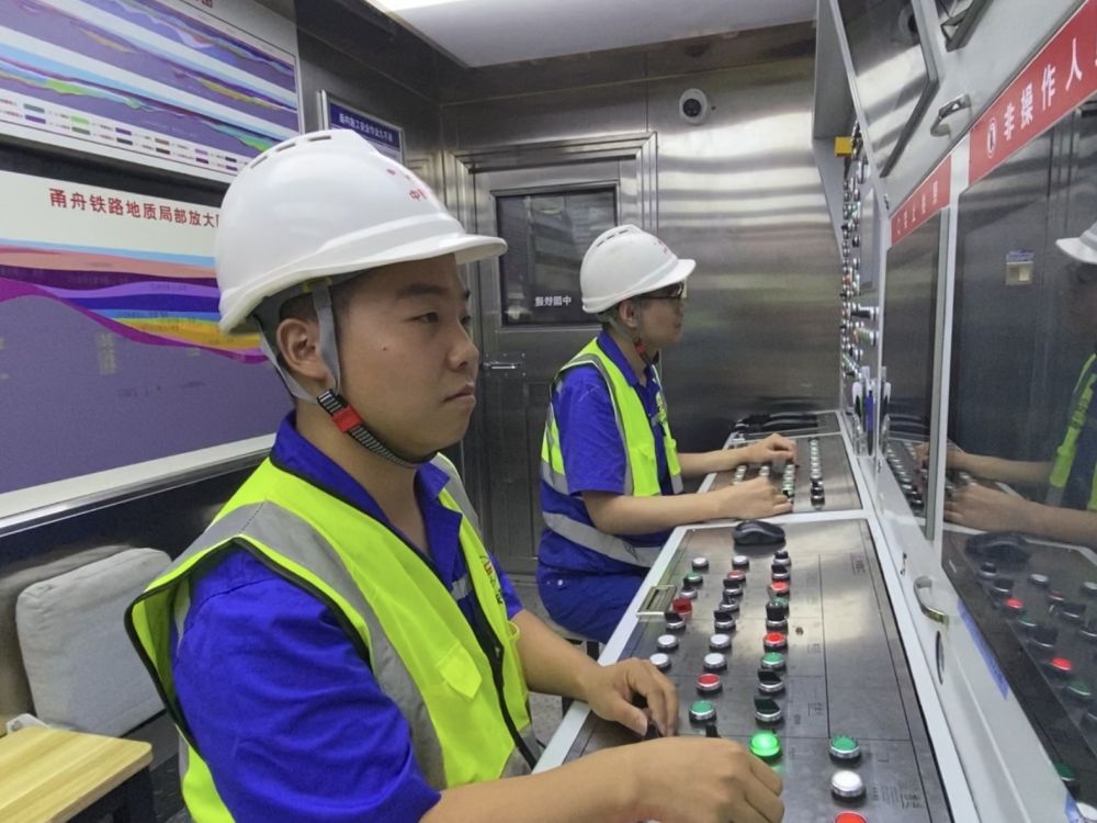 图为中铁十四局甬舟铁路项目盾构机长栗晨(左一)在盾构机驾驶室内操作。新华社记者魏一骏 摄