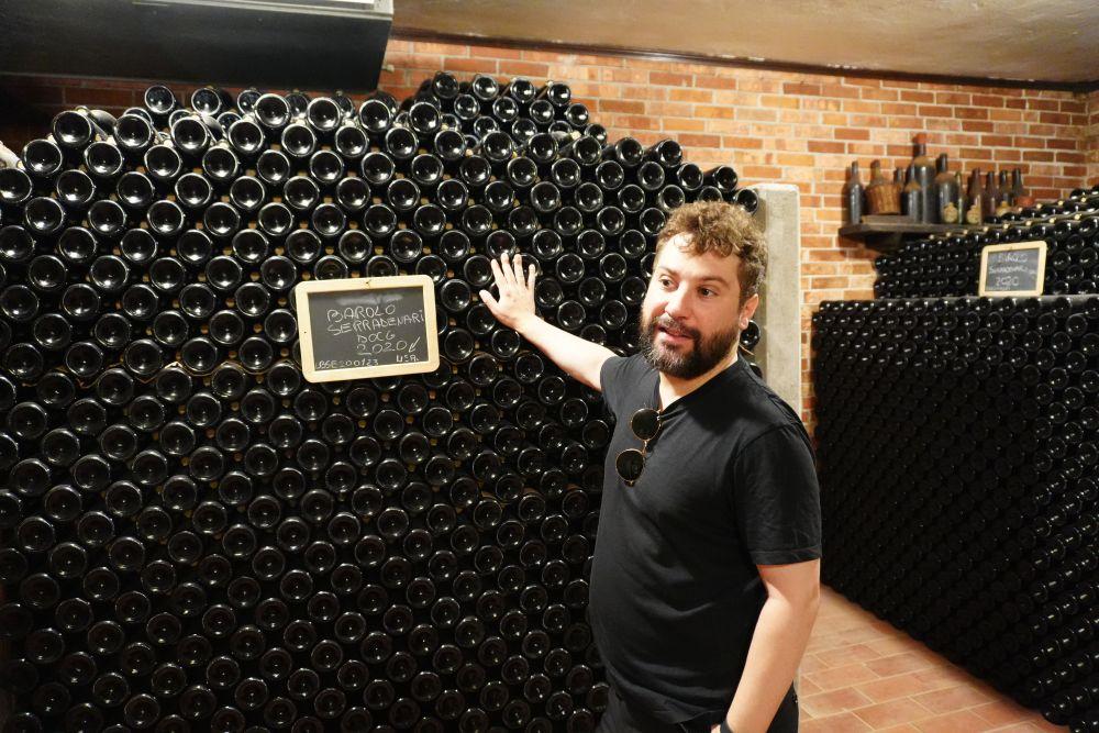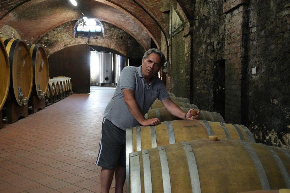 8月17日,在意大利拉莫拉镇,马斯卡雷洛家族酒庄负责人法比奥·马斯卡雷洛在酒窖里工作。新华社记者张馨文摄