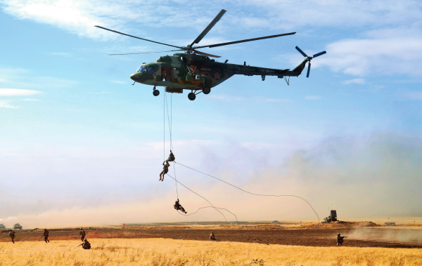 在俄罗斯奥伦堡州东古兹靶场举行的“和平使命-2021”上海合作组织联合反恐军事演习实兵实弹演习中,多国联合部队特战分队执行索降作战任务(资料照片) 梅世雄摄 / 本刊