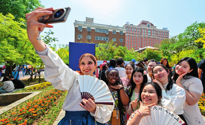 中外青年在以“上合之约 天外同彩”为主题的天津外国语大学第八届国际文化节上合影留念(2025 年 4 月 20 日摄)孙凡越摄 / 本刊