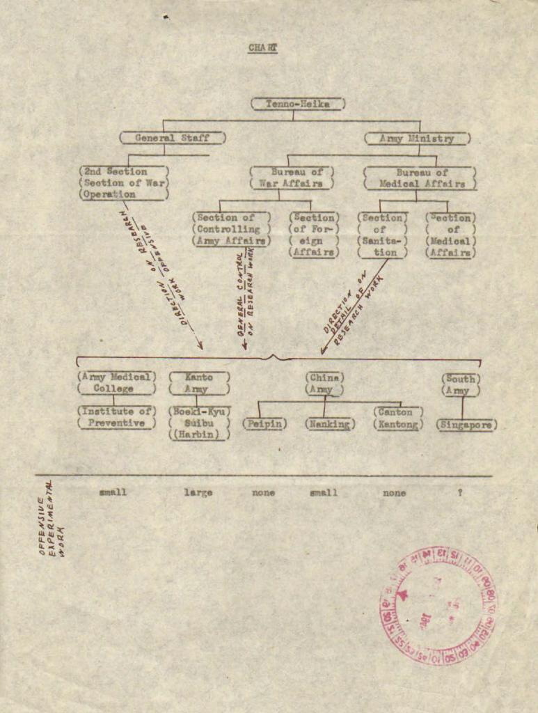 日本投降后,美国派德特里克堡基地细菌战专家桑德斯调查有关情况。在731部队重要成员、9420部队总务部长内藤良一提交的细菌战部队组织架构图中,天皇居顶端,经过三个指挥层级,与最底层并排的各细菌战部队相连。这些部队下方均标注着是否进行攻击性生物武器实验及规模大小。