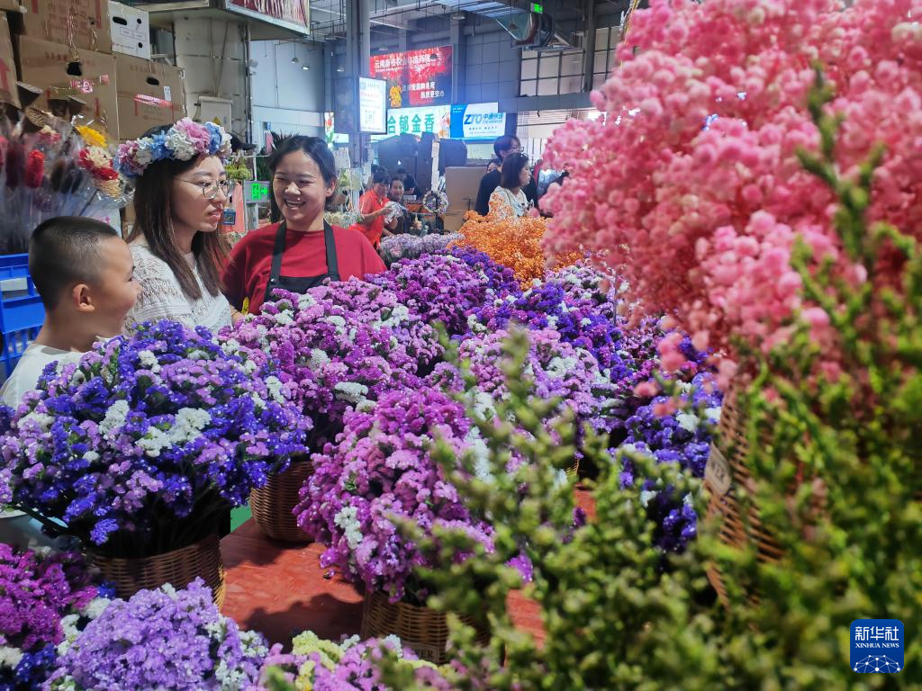 游客在昆明斗南花卉交易市场购买鲜花。新华社记者 浦超 摄