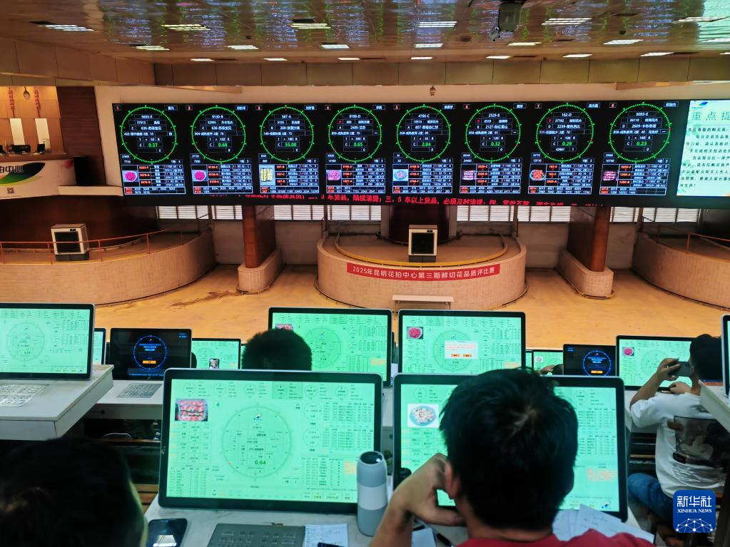 记者在昆明国际花卉拍卖交易中心看到,拍卖大钟界面显示着各种花卉的信息,数百名购买商操作着竞价器选购鲜花。昆明国际花卉拍卖交易中心副总经理汪洋介绍,这里每天的鲜花交易量都超700万枝,单日最高交易量超1100万枝,30%以上的鲜花被各大电商和直播团队拍下,他们再拿到电商平台或直播间销售。