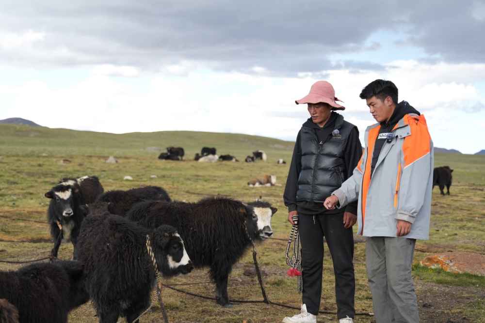 图为巴登求扎团队工作人员查看牧区牦牛情况。何欣然摄
