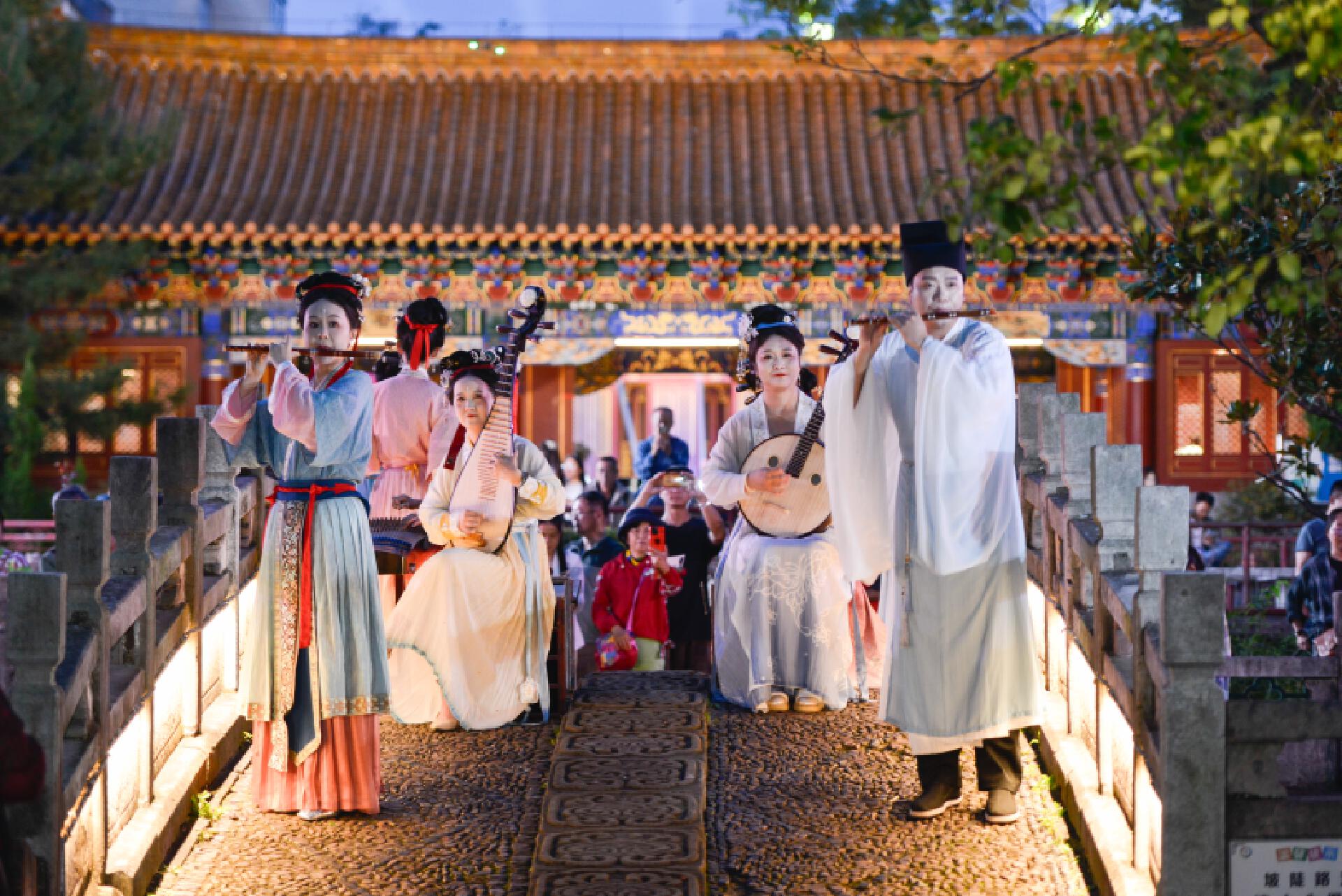 19:30,状元桥畔率先响起悠扬乐声,“鹊梦千年・情满春城”民乐雅集拉开了夜晚演出的序幕。二胡、中阮、笛子、古筝、琵琶的合奏在廊桥间回荡,清越的旋律与文庙的砖木结构、石刻雕花相互呼应,营造出“乐在景中,景在乐里”的沉浸式体验。