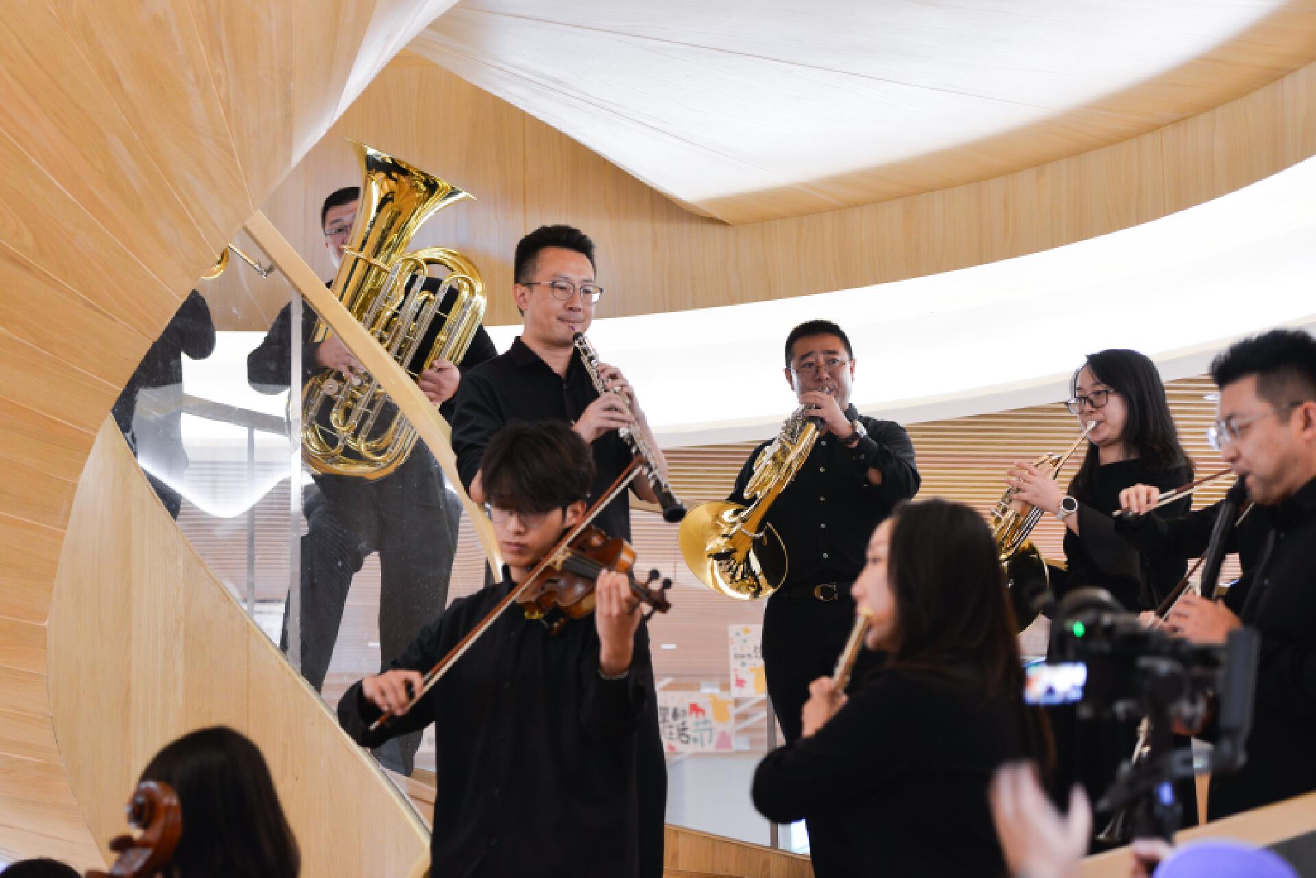 期间,昆明聂耳交响乐团的演奏者们,以一场快闪亮相“百里春秋”旋转楼梯。弓弦跃动间,《我和我的祖国》等旋律顺着旋梯流淌,古典乐的厚重撞上现代建筑的流线感,让驻足的人群在猝不及防的惊喜里,接住了这场传统与现代交织的浪漫——音符绕着台阶攀升,情怀随着乐声漫溢,瞬间成了城市里最动人的风景。