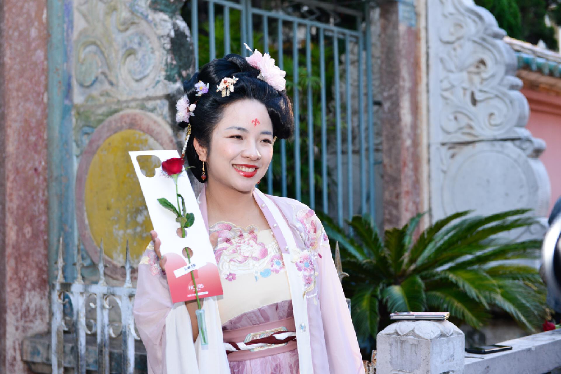18时,“22°C的昆明,100%的热爱”七夕送花活动准时开启,为文庙的浪漫氛围再添浓墨重彩的一笔。工作人员手捧精心设计的花束,向市民与游客派送,各式各样鲜花搭配的花礼,传递着“春城无处不飞花”的温情。“本来只是路过,没想到收到这么美的花,昆明也太懂浪漫了!”来自重庆的游客李女士举着花束,在文庙牌坊前拍照留念。收到花的老夫妻相视一笑,将花束小心捧在手中,慢慢踱步欣赏夕阳下的文庙;年轻情侣则借花束合影,让这份意外之喜成为七夕的甜蜜。作为“时时刻刻·昆明文旅送花宠客”行动的七夕特别版,这场送花活动让“宠客”不再是口号,而是触手可及的温暖。