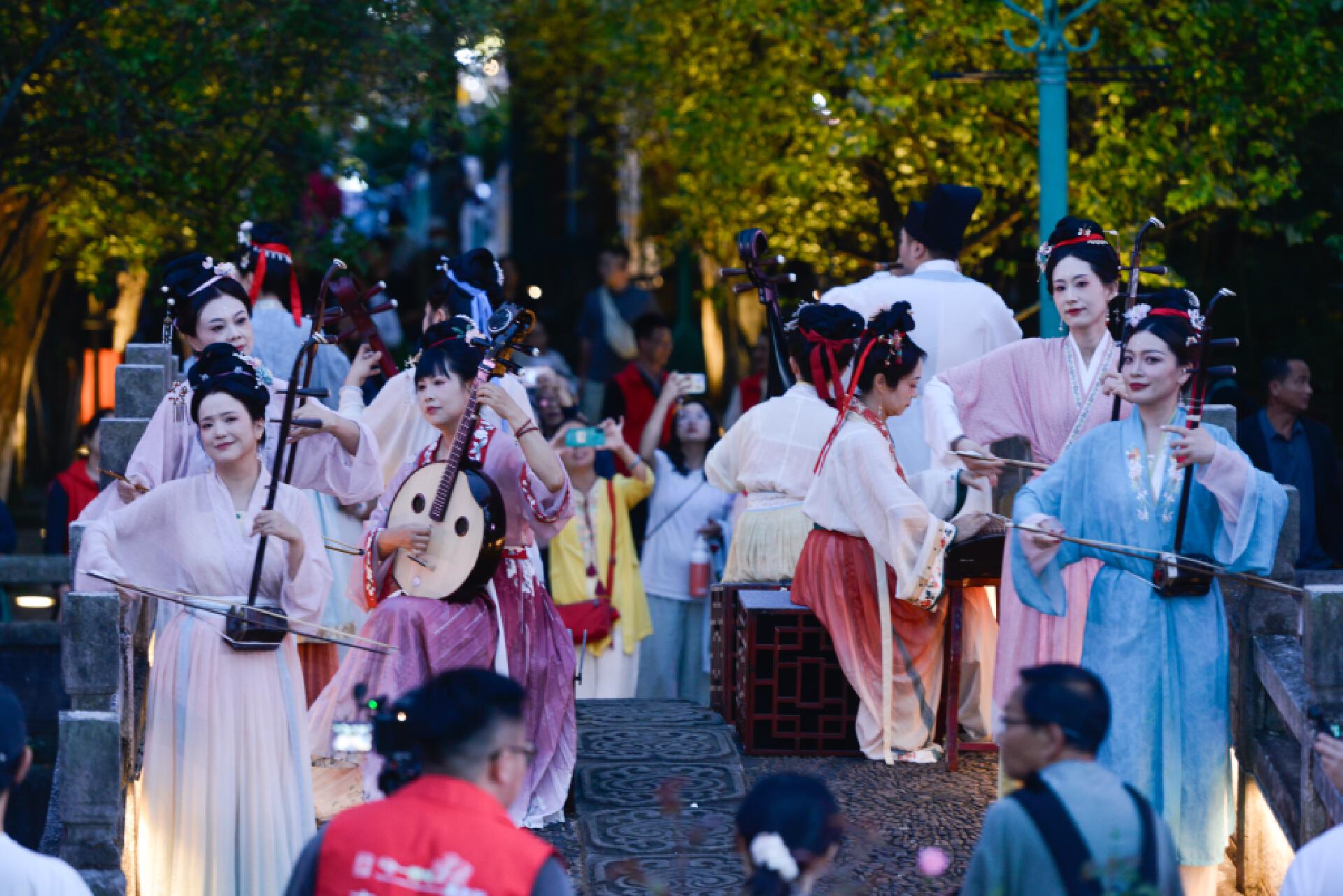 演奏者们身着传统服饰,或坐或立,与观众近距离互动。观众们围在桥边,有的静静聆听,有的跟着节奏轻晃身体,当《在水一方》的旋律响起,不少人轻声跟唱,古老的状元桥成了最有韵味的音乐厅。
