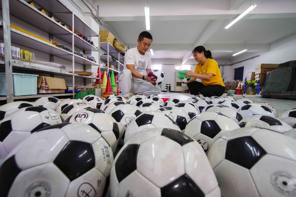 8月25日,河北省遵化市第二中学体育教师在擦拭整理足球。新华社发(刘满仓摄)