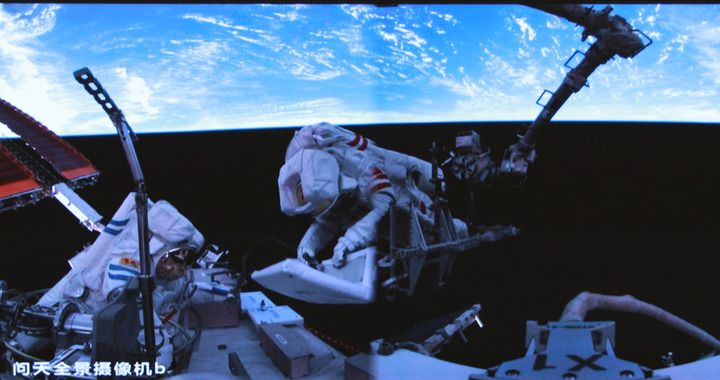 这是2025年6月26日在北京航天飞行控制中心屏幕上拍摄的神舟二十号航天员陈冬(左)与陈中瑞在空间站组合体舱外工作的画面。新华社发(周柯毅摄)