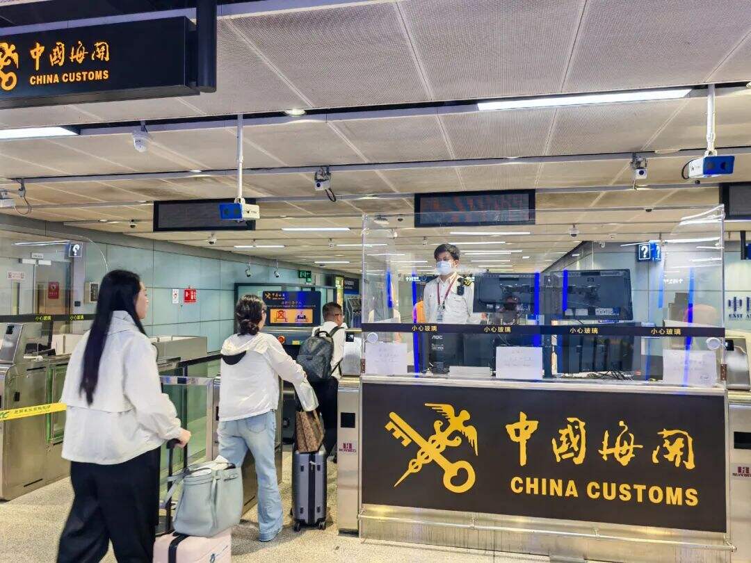 海关关员在昆明长水国际机场旅检入境通道对旅客及行李物品进行监管。图源昆明海关发布