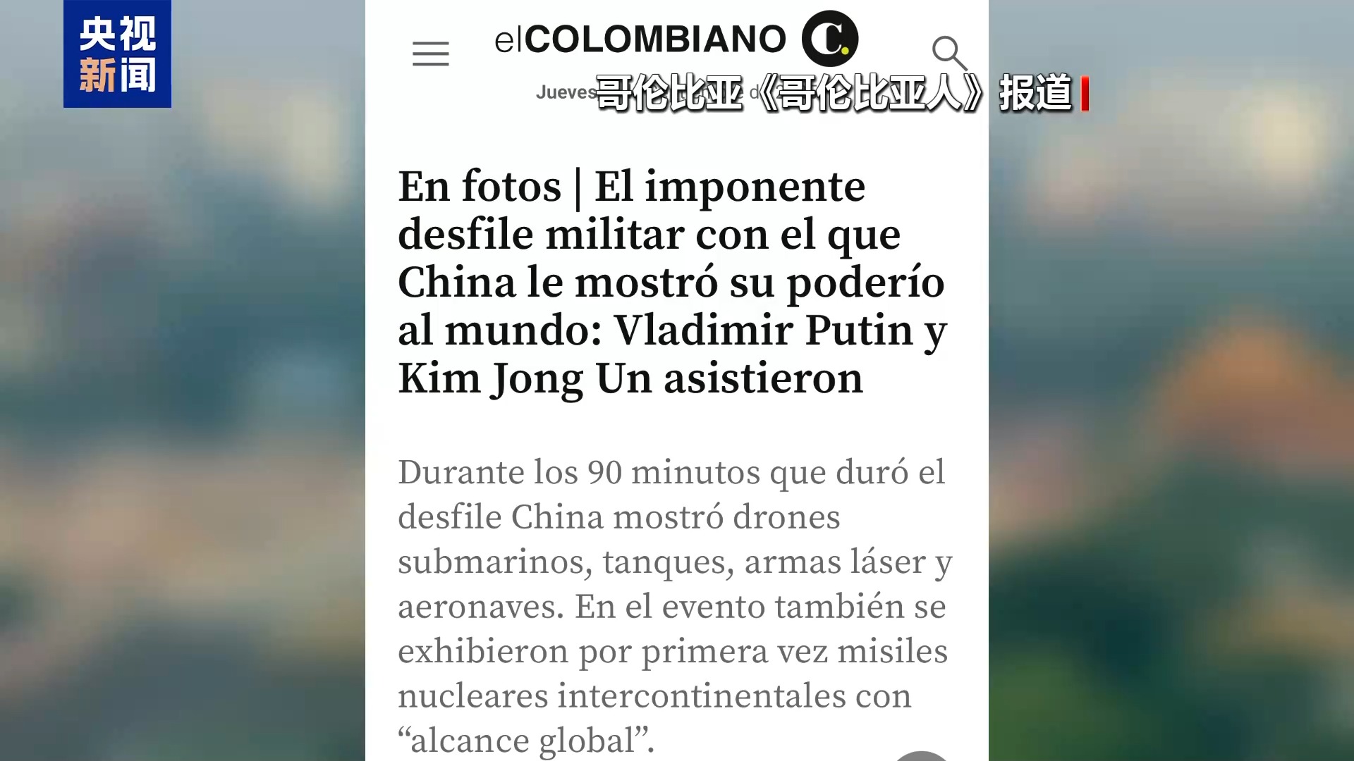 哥伦比亚西班牙语综合性日报《哥伦比亚人》报道说,中国展示了水下无人装备、新型坦克、激光武器和各类战机等。
