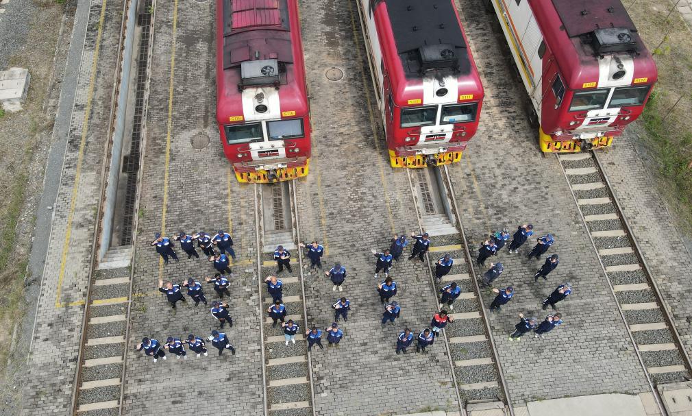 2025年8月19日,在肯尼亚内罗毕非洲之星铁路运营有限责任公司机务运转整备场,中肯两国铁路工作者在机车前站列并组成“3000”字样,以纪念蒙内铁路实现安全运营3000天(无人机照片)。新华社记者 杨光 摄