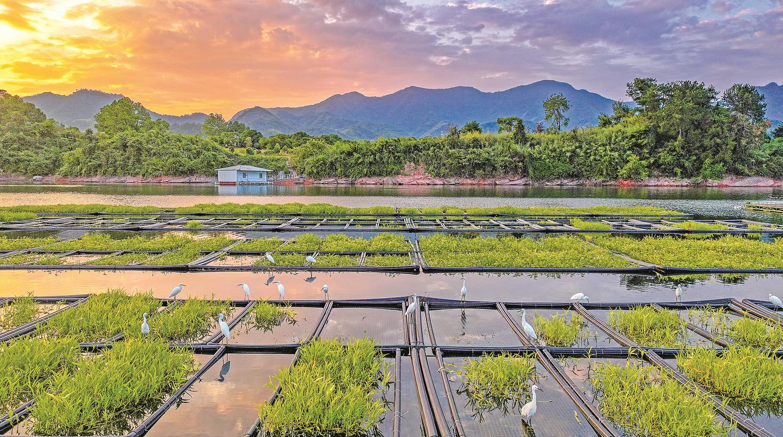 浙江省淳安县高度重视生态文明及环境保护工作,自然生态环境不断改善,鸟类数量逐年增加。在千岛湖镇,时常有白鹭栖息,或嬉戏觅食,或展翅飞翔。图为9月4日清晨一群白鹭在生态浮岛上觅食,构成一幅生态美画卷。(中国旅游报 中新社发)