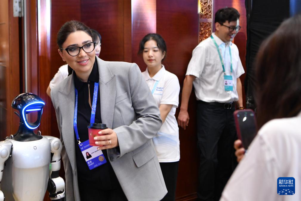 9月7日,嘉宾在论坛上与智能机器人合影。