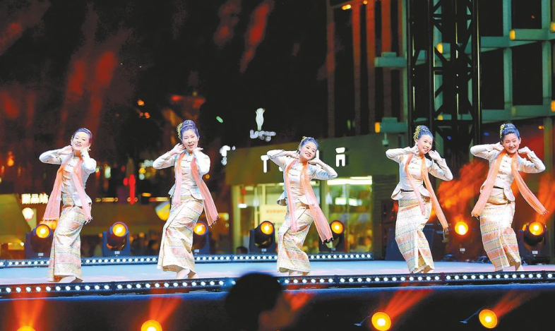 9月5日,在“南方之夜”文化展示活动中,缅甸代表团表演节目《欢笑迎宾舞》。