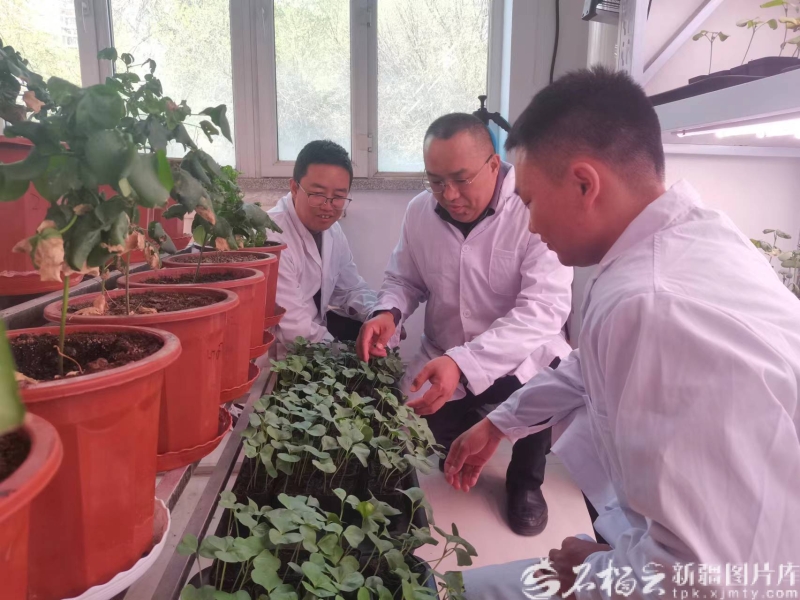 新疆农科院经济作物研究所棉花分子育种创新团队郑巨云研究员(中)与团队成员一起开展棉花耐低温材料鉴定评价。图/自治区农科院(资料图)