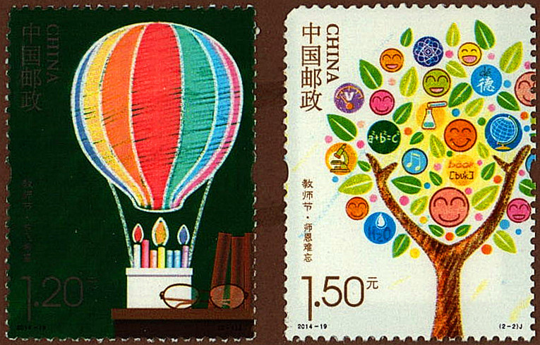 2014年9月10日,中国邮政发行《教师节》纪念邮票一套2枚,以隐喻与象征再写颂歌。第一枚“放飞希望”,邮票画面上的粉笔盒、书本、老花镜以及黑板上的热气球,勾勒出老师带领学生遨游知识星河的浪漫想象;第二枚“师恩难忘”,邮票画面从“桃李满天下”的概念入手,将教师的形象幻化成张开双臂的树干,托起学生们的一张张笑脸,寓意老师的辛勤耕作换来丰硕成果。