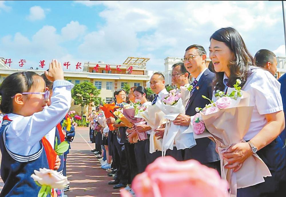 在云南大学附属中学星耀学校日前举行的教师节庆祝活动上,学生代表向老师敬献鲜花。记者段晓瑞/摄