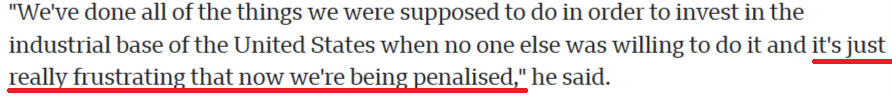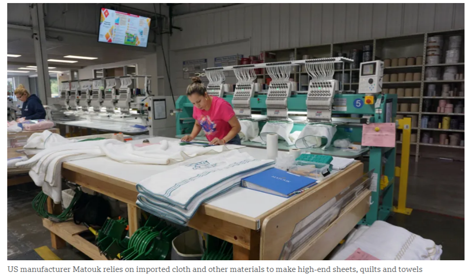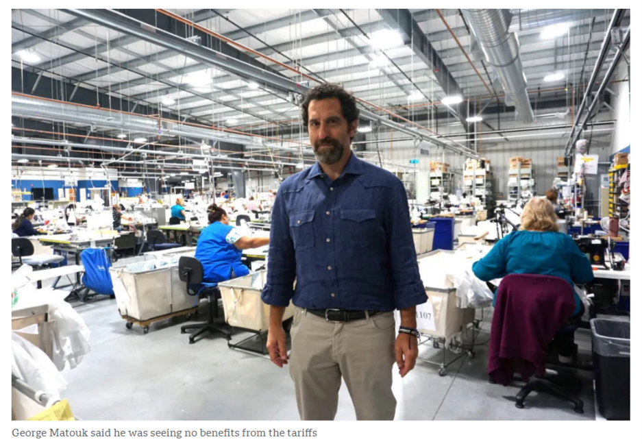 马图克表示,从今年4 月到 8 月,关税导致其每月增加超过 10 万美元的成本,因为高额关税影响了来自印度和葡萄牙的棉布、来自列支敦士登的羽绒等原材料的供应。不仅如此,增加的成本还迫使企业削减了在新设备以及营销方面的开支。乔治•马图克说,他“没有从关税中看到任何好处”。