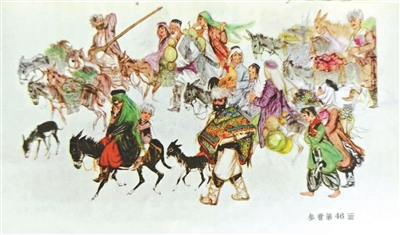 用毛笔在宣纸上直接画速写乃是他的看家本领,当他把这本领与传统笔墨有机融合起来,看似没有规矩,但在《天山南北好地方》的插图中,却尽显传统与现代交融的独特韵味。有着极高艺术鉴赏力的邓拓,对黄胄的画尝下以“纵情”二字断语,可谓只眼。他的画线条粗犷、遒劲却又不失灵动细腻,气势磅礴却笔墨淋漓,画“天山南北好地方”真是再合适不过。不是说画毛驴儿是他的“一绝”吗,但倘若没有这法子,毛驴儿的 “脾气” 何以画得出来?巴楚中途站服务员运水图里,头驴用浓墨压身,线条沉得发闷,那是负重前行劳累所致,耳朵耷拉着,那是老实干活的“老把式”姿态,它似乎在与身旁的小驴儿讲述故事,或传授经验罢?从小驴儿眼神可以看出,初时它或在抱怨路途的遥远,但听了“老把式”的讲述却又像受到鼓励一般乖巧;紧跟其后的,墨色虽稍淡一点,但却以飞白突出耳朵,表示它们被那一老一少的谈话吸引而竟忘记了劳累;驴背上的木桶更妙,桶沿扫出几道淡墨的水痕,那是因毛驴的步子欢快才荡溢出来——此端的画驴耶,画人耶?兴许我们已经不好作出判断了。线条上,黄胄把传统“骨法用笔”和速写的“纵情”拧在了一起。画人物长袍的褶皱,借鉴了白描“春蚕吐丝”的流畅,却在转折处多了点“毛糙”,不是刻意的规整,是布料裹着身体的自然;画去往巴扎的牧民的皮靴,线条粗得发沉,是走了长途的厚实,鞋尖磨白的地方用淡墨扫过,是常年磨损的痕迹。这线条,没有传统仕女画的纤巧,也没有山水画的轻灵,却显露着新疆人的厚道和实在。