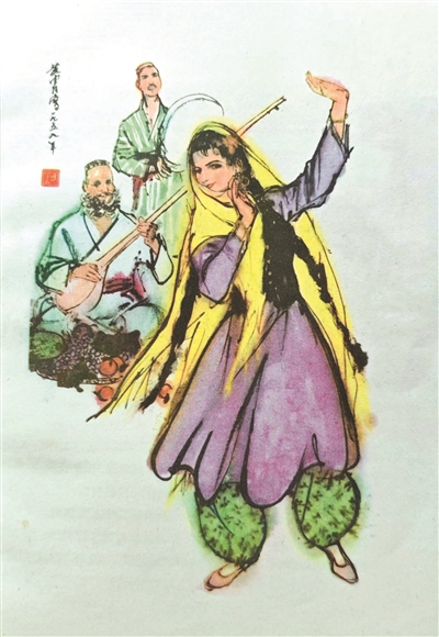 落实在《天山南北好地方》的插图里,我们可以看到,原本紧裹动感的新疆细节,竟被他以极速手段钉在了纸页上。细看封面上的姐弟骑驴出行图,驴蹄的线条粗短有力,是踩在沙土路上的实在。人物衣袍的褶皱,是斜“挂”着的,像是毛驴儿一步一颠晃出来的效果,便是男孩腰间系带垂落的弧度,都现着身体摇晃的律动。那幅舞蹈图更见其真章,维族姑娘手臂高扬,线条不是直挺的,是带着颤劲儿的斜扫,是舞动带来的风把袖子吹得“突突”地晃;裙摆旋出的不规则圆圈,是刚刚转起来的那一瞬,我们甚或可以联想到,她脚下羊毛地毯上的细碎被裙摆扫起后发出的细微的窸窣声。
