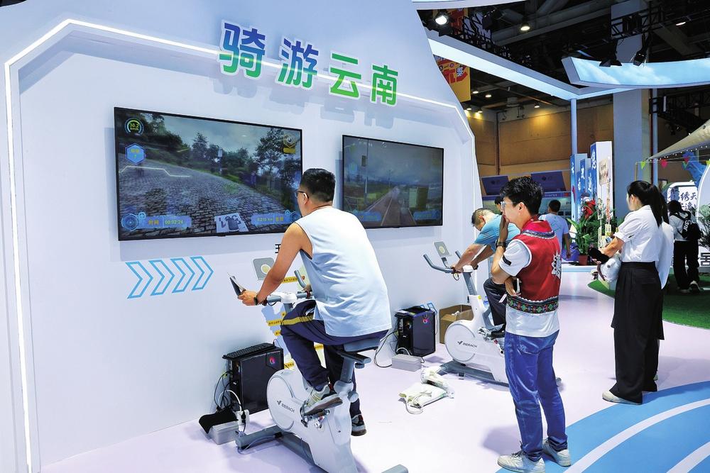 云南展台凭借科技与文化的创新融合,成为博览会焦点。展台巧妙运用现代科技手段,打造了引人入胜的沉浸式运动体验空间。“虚拟骑游云南”项目模拟滇池、抚仙湖、怒江大峡谷等8条特色线路,让参观者通过脚踏自行车领略云南美景,获得身临其境的美好体验。同时,展台还融入了云南咖啡文化体验,传递出健康生活与休闲娱乐完美结合的“云南生活方式”,吸引大量观众驻足。来自台湾的参观者郭金林在互动后开心地表示:“我去过云南的玉龙雪山等地,非常喜欢云南,这次云南的展台真的很棒。”