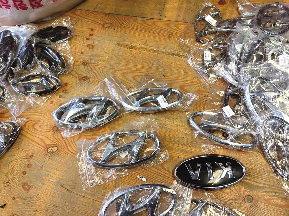 记者在现场看到,两间仓库中间搭建了阁楼,楼上楼下堆满了各种汽车配件。在仓库二楼,民警从一个纸箱里找到数十个现代、起亚车标,还有汽车大灯、尾灯、保险杠、中网等各种配件。这些配件外包装盒上,没有生产厂家、地址和电话号码。现场一名工人说,仓库里各种配件,对韩系车都适用,“像这种大灯,一盏灯需要370元,有些大灯更贵”。