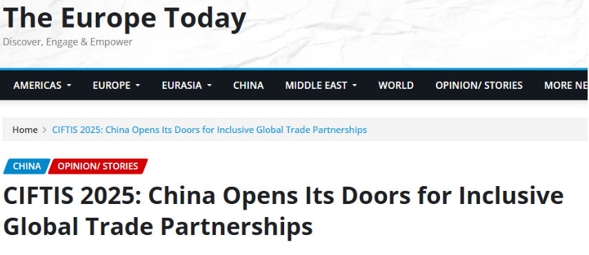 今日欧洲网站(The Europe Today)13日的报道指出,服贸会展示了中国对包容、开放和前瞻性的服务贸易的承诺。中国持续扩大市场准入,为全球企业创造广阔机遇。
