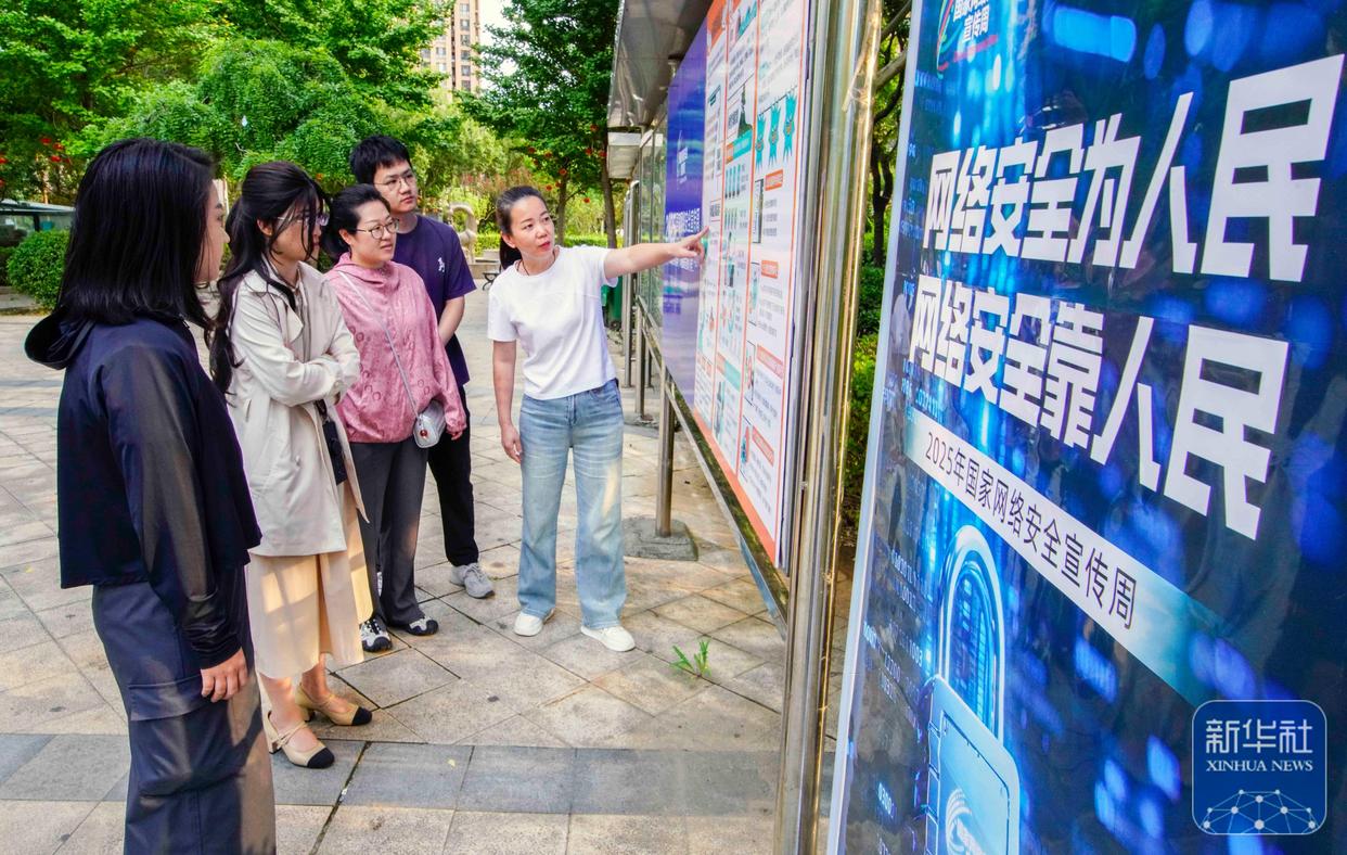 9月15日,河北省遵化市华明路街道依水现代城社区的居民在观看网络安全宣传栏。新华社发(刘满仓摄)