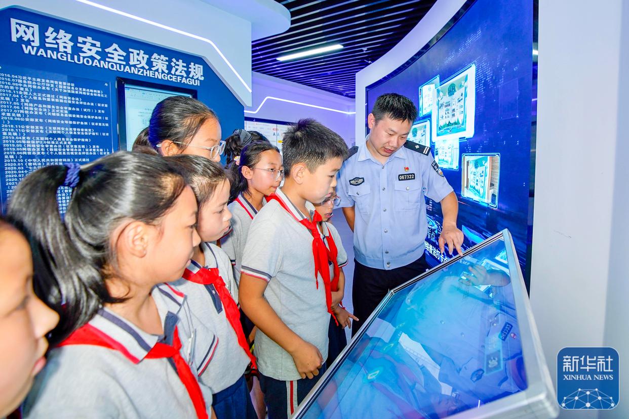 9月15日,在山东省青岛市市北区延安二路小学开展的网络安全教育主题活动上,民警为学生们讲解防范电信诈骗小常识。新华社发(王海滨摄)
